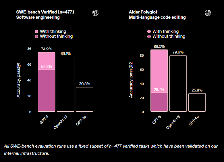 - Multiple variants: GPT-5 mini offers near-identical performance at 1/5th the cost with only 5 percentage points lower on benchmarks
